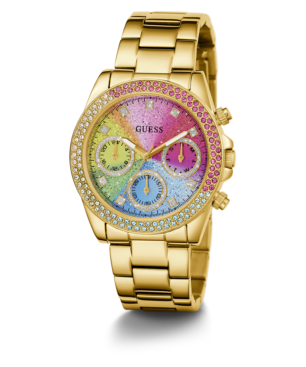 Goudkleurig dameshorloge met ombre glitz-wijzerplaat en dubbele rij kristallen op de lunet.
